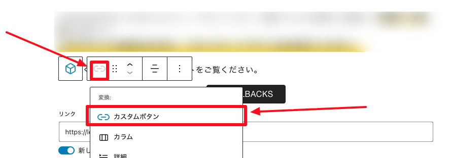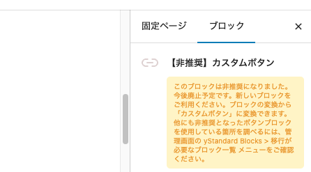 「非推奨」という表示が出る場合は、旧ブロックとなりますので、新しい「カスタムボタン」への変更をお願いいたします。